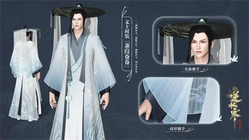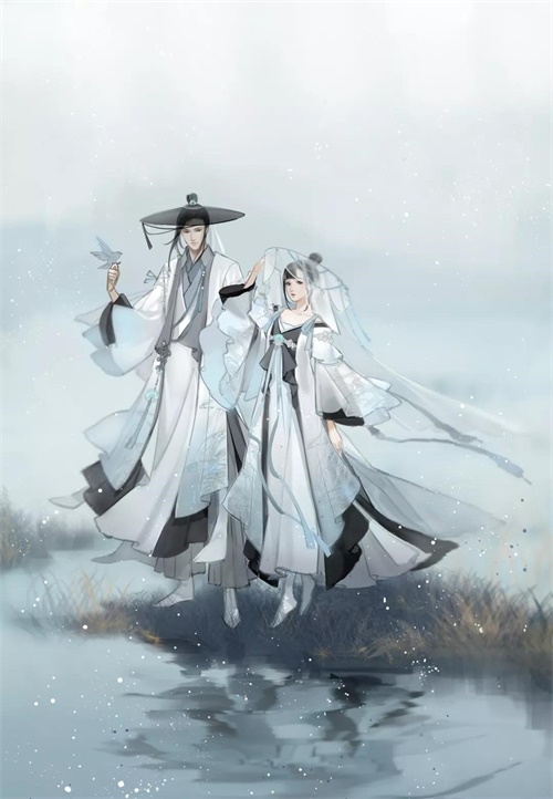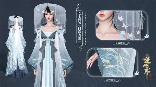 同款双色的设计,来源于清晨与黄昏时不同的芦苇丛景象。如果玩家有心的话,会发现衣摆、衣袂处皆绣上了芦苇之形,同时又辅以多层裙摆来塑造苍茫的隐士之意。整套白露时装所搭配的头饰中也加入了飞鸟意象,代表着悠然出世、无拘无束的人生态度。着此素衣,立于潇潇芦苇中,古代隐士的处世哲理,也就自在不言中了。