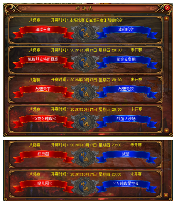 冠军帮会争霸联赛将采用一对一淘汰制,胜利的帮会将直接进入下一轮比赛,失败方将在比赛结束后立刻获得全员奖励。赛程时间为10月17日,10月21日,10月25日以及决赛的10月29日。听说还有参赛帮会在招兵买马呢!平日的独行侠们也千万不要错过这次参赛的机会呢!对战信息也已经新鲜出炉!