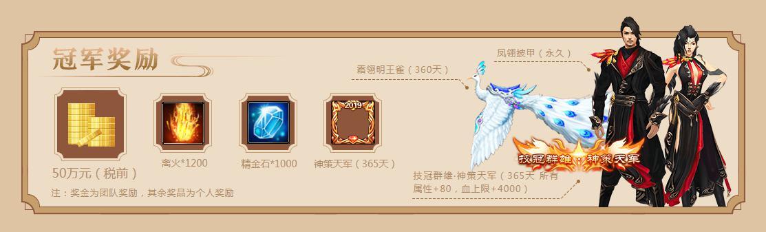 对于这些敢于挑战最终巅峰的勇士,我们也准备了一份特别的奖励,总额高达70万元人民币的现金奖励及诸多的珍稀道具。而冠军队伍更将获得坐骑:霜翎明王雀(360天),时装:凤翎披甲(永久),头像框:神策天军(365天),称号:技冠群雄·神策天军(所有属性+80,血上限+4000)!10月12日,让我们屏息以待,见证新一代的武林传奇!
