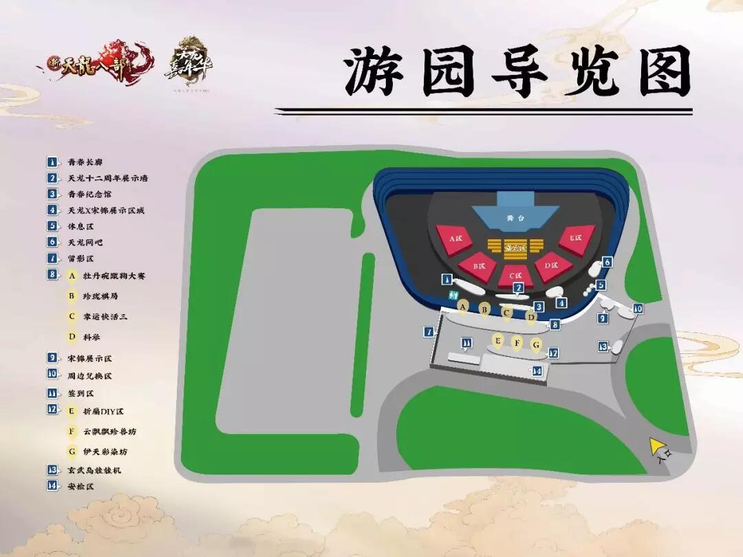 说完了内场的激动人心,外场的精彩也不容小觑。我们准备了一系列精彩的互动活动,牡丹碗蹴鞠大赛、珍珑棋局、幸运快活三、科举等等...参与即可赢取印章兑换实物周边!龙八部X中国黄金十二周年纪念币、神器礼盒、人形抱枕、宋锦T恤、宋锦手提袋、嘉年华订制雨伞、天龙DIY T恤等等超多奖励,让你拿到手软!