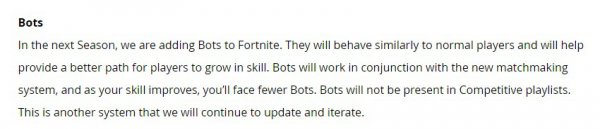 在新赛季中,我们将为《堡垒之夜》增加机器人。他们的习惯将与普通玩家类似,将为玩家提供一个更好地途径来提升自己的技能。机器人将与新的匹配系统协同运作,当你的能力提升后,你将面对更少的机器人。机器人将不会出现在竞技模式中,这是我们将继续更新和迭代的另一个系统。