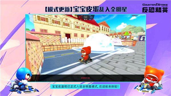 9月25日之后,“跑跑卡丁车”经典角色宝宝、皮蛋也将正式加入“全明星”的行列。T阵营的玩家将可能随机到驾驶卡丁车的宝宝进行作战,而CT阵营的玩家则可以使用皮蛋与你一起并肩作战。使用宝宝和皮蛋角色后将会切换为第三人称视角,战斗时不仅可以使用助推器大幅提升车速,快速接近或摆脱敌人。还可以投掷水炸弹进行攻击,给敌人造成极高的伤害和范围击飞效果。两个技能配合得当,混战时可以发挥出极强的控场效果,堪称“打团”搅屎棍。相信你们一定会喜欢上宝宝、皮蛋这两个调皮的家伙的!