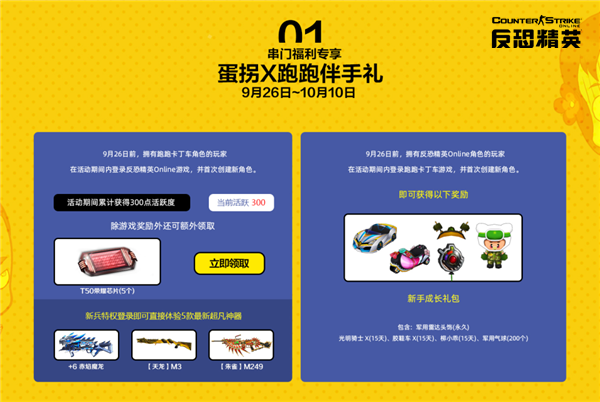 9月26日~10月10日,《反恐精英Online》和跑跑卡丁车将开启一系列联动专题福利活动。活动期间,跑跑卡丁车首次在《反恐精英Online》创建新角色,不仅可以直接体验+6赤焰魔龙、【天龙】M3、【朱雀】M249在内的5款最新超凡神器,活动期间完成游戏内任务,还可以解锁各种强劲武器、芯片、道具。累计300活动积分,拥有跑跑卡丁车角色的玩家还可以获得5个T50荣耀芯片的专享礼包哦!而《反恐精英Online》在跑跑卡丁车创建新角色,可以立即领取劲爆新手礼包。并且也有一系列福利活动在等待着你们呦!