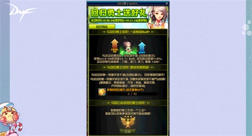 回归勇士送好礼:活动期间,与回归勇士组队将会获得专属BUFF,一起通关推荐地下城还将获得额外材料以及回归硬币。玩家通过使用回归硬币可以兑换白金徽章礼盒、纯净的增幅书、+7增幅券、超界装备等各色好礼。除此以外,回归勇士七天签到以及使命任务同步开启,海量福利悉数奉送。