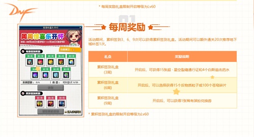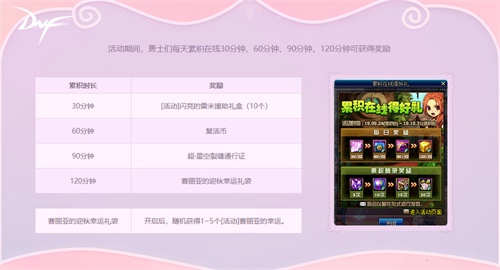 累积在线赢好礼:活动期间,勇士们每天累积在线30分钟、60分钟、90分钟、120分钟均可以获得各色道具奖励。除此以外,勇士们累积领取120分钟奖励5次、10次、15次、20次均可获得累积奖励,奖品包括黑暗之眼灵能碎片礼盒(500个)、精炼的时空石礼盒(20个)、黄金品级调整箱、+8增幅装备增幅券。