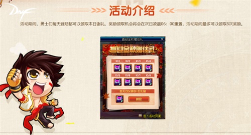 周周惊喜乐开怀:活动期间,勇士们累积签到可以获得大量史诗材料,完成累积9周签到更可以获得1张稀有装扮兑换券。
