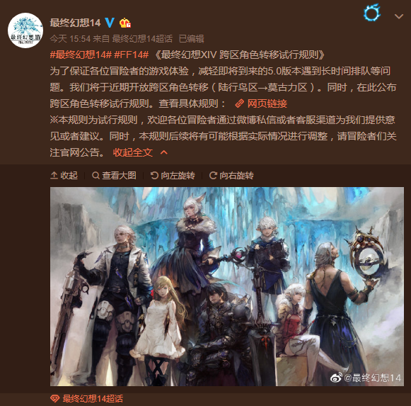 《最终幻想14》官博发布消息,游戏将于近期开放跨区角色转移(陆行鸟区转移至莫古力区),同时还公布了跨区转移试行规则【了解详情】。