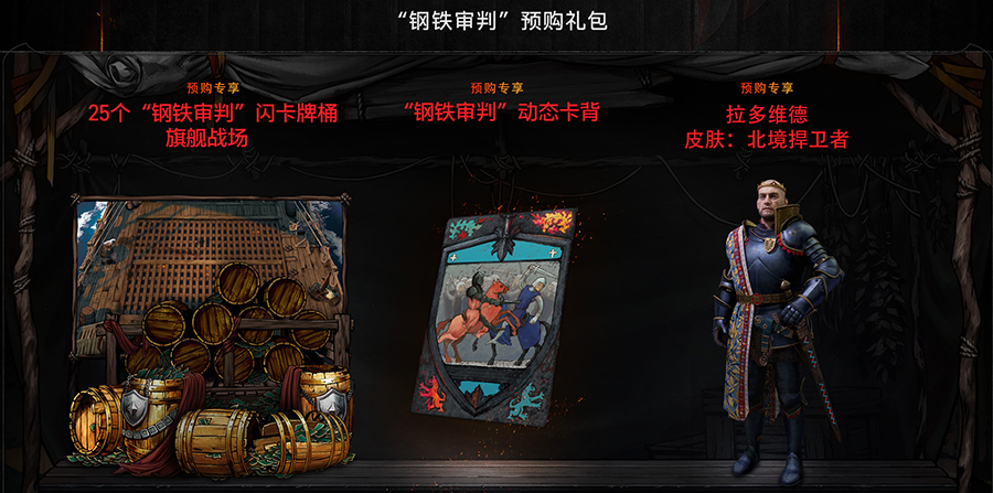 “钢铁审判”预购礼包内含25个“钢铁审判”闪卡牌桶、“旗舰战场”游戏牌桌、“钢铁审判”动态卡背,以及“北境捍卫者”拉多维德领袖皮肤等专属道具。礼包购买仅开放至10月2日“钢铁审判”扩展包上线时,感兴趣的玩家一定不要错过!详情可前往游戏内商城或活动页面了解(https://www.playgwent.cn/activity/ironjudgment)。