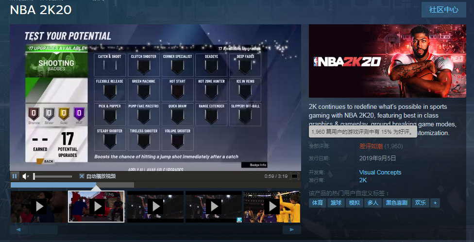 篮球大作《NBA 2K20》自发售以来差评不断,截止撰稿本作在Steam上好评率仅有15%,全部评测中显示“差评如潮”。