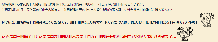 这一推测也得到了网易暴雪合作部总经理的转发,百万人气基本是八九不离十了。或许是被排队困扰的玩家实在太多,此事甚至惊动了网易CEO丁磊,丁磊表示,“我们会安排免费转服的手段,敬请期待”。