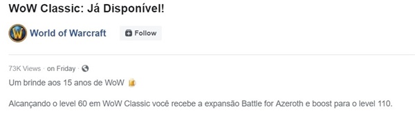 近日《魔兽世界》巴西官方在脸书上宣布玩家在怀旧服满级后,将可以获赠正式服免费直升110级的资格。不过很快,该脸书账号就删除了这则消息。