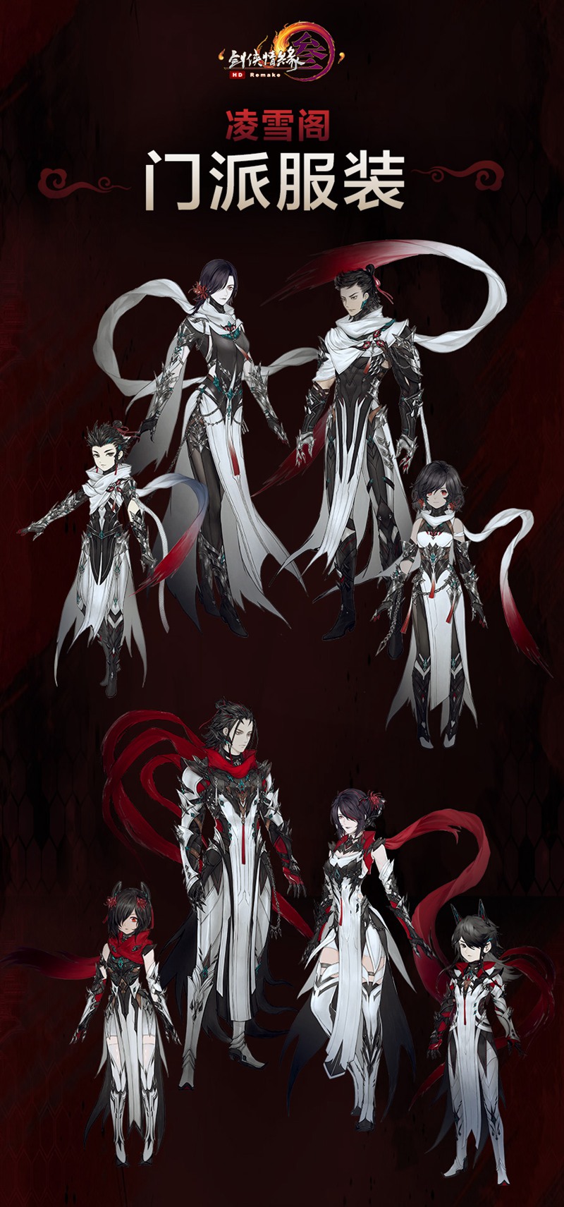 凌雪阁,以紧身劲装为主,主体颜色为黑白红加一些青铜色装饰和棕色皮带点缀。红色就像太白山里的指路旗子。而青铜,则是岩石上的青苔。