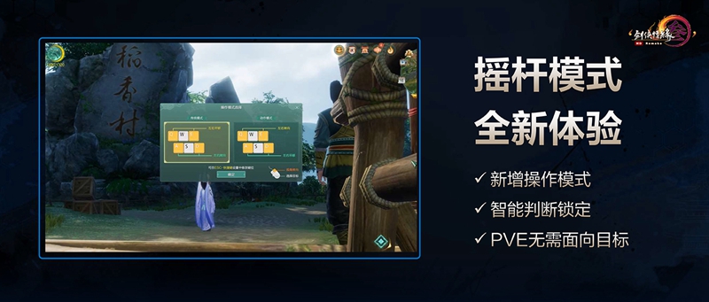 全新的摇杆操作模式下,基于当前传统的WASD方向键在按下移动时,侠士所操作的角色将基于当前镜头朝向进行向前/向左/向后/向右的方式直接移动,而非基于角色的前进/左旋转(左平移)/后退/右旋转(右平移)方式移动。这一移动方式将使得侠士的角色操控更为迅捷,灵敏。