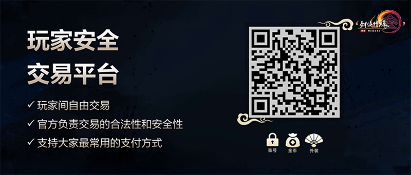 官方负责交易的合法性和安全性,且支持多种常见的支付方式。该平台将于年底正式上线!交易平台初期覆盖游戏内不绑定道具的交易需求,后期还将追加账号交易!并将以“安全保障,官方验证”“自由买卖,快速结算”“资质齐全,支持提现”为宗旨,为侠士们的账号资金安全保驾护航!