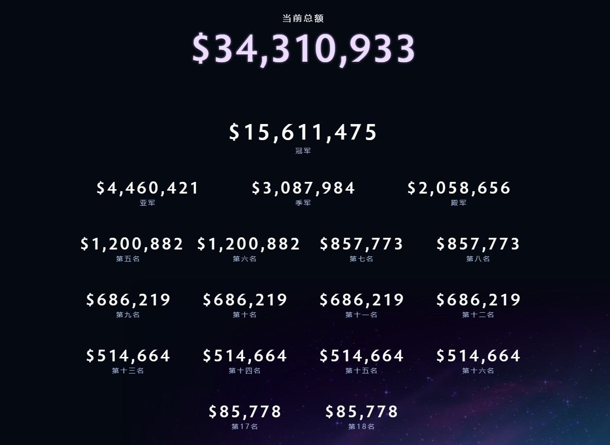 Ti9总奖金池达到了34310933美元,而冠军可以获得15611475美元奖金,超过1.1亿元人民币。
