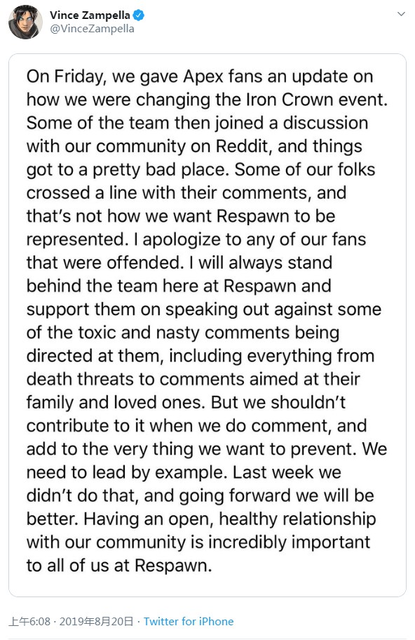 “我向所有被冒犯到的粉丝们道歉,我们的员工的确做过了,但对于那些发布侮辱或者威胁言论的人,我永远站在员工这边。今后我将带头与员工共建《Apex英雄》健康的社区环境。”