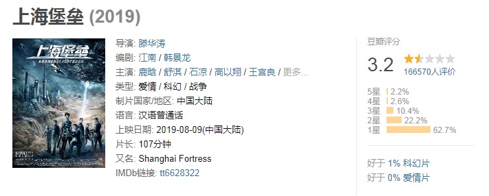 截止到21日,《上海堡垒》票房1.2亿,豆瓣评分3.2分,排片仅有0.2%,这意味这这部(据说)耗资3亿制作6年的“科幻大作”正式失败,同时它也在中国影史上留下了浓厚的一笔,当然是不好的那种。
