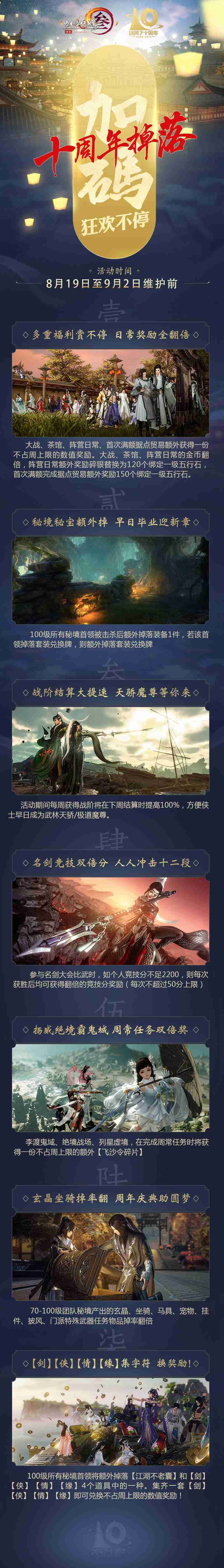 随着8月28日《剑网3》十周年盛典的临近,众多惊喜活动逐一揭晓,《剑网3》十周年线上活动第二弹现已火爆进行当中!日常奖励大提升、秘境秘宝额外掉落、战阶结算大幅提速、名剑竞技双倍积分、飞沙令周常额外奖励、玄晶坐骑掉落翻倍、剑侠情缘集字兑奖等七大福利强势上线,诚邀侠士前往体验!