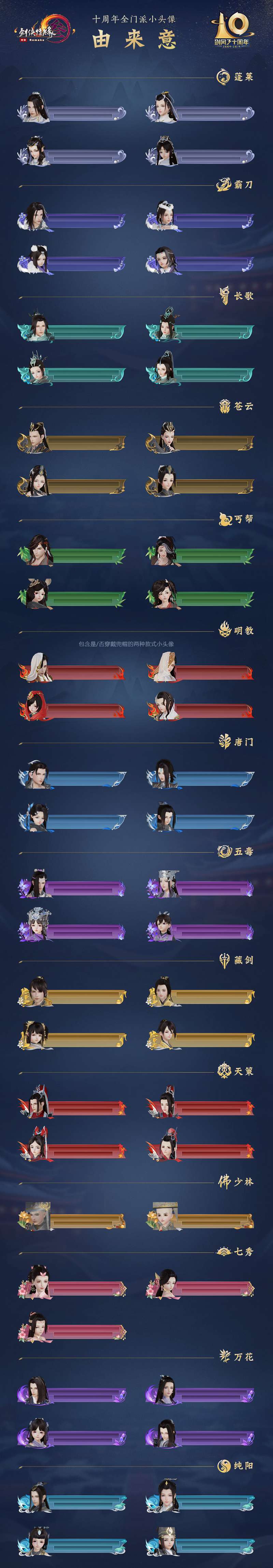 十周年纪念十四门派头像“由来意”,意指每个头像背后都有独特的含义。全新十四门派头像为每个体型量身定制,选用了备受侠士好评的“鹤梦”套校服进行设计,选取了来自各位捏脸太太优秀的脸型作品,搭配采用了各门派的经典配色配套头像框,并辅以门派特色的风物加以装点,精心打造,极具纪念意义!