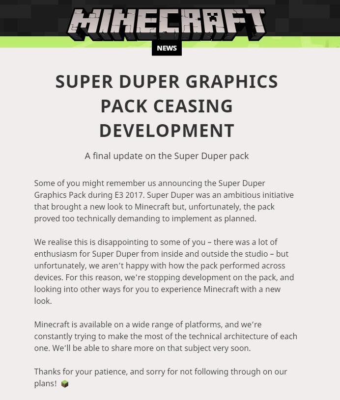 2017年E3微软发布会上曾公布过的《我的世界》“超级画质升级包”,近日被宣布取消,该升级包原计划在2017年秋季推出,目的是对《我的世界》视觉效果进行大幅翻新。根据官方公告,升级包取消的主要原因是技术要求太高,无法按计划实施。