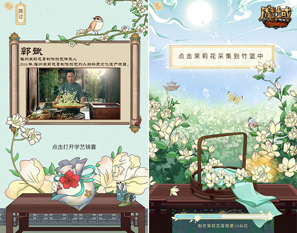 茉莉花膏是一门传统手艺,《魔域》特邀新中国第一代调香师、非遗传承人——郭斌大师,秉承古法工艺,坚守中华香魂内蕴文化,用冷吸古法匠心打造本届花魁赛绝版限量的茉莉主题臻品!而在H5活动中,玩家跟随郭斌大师,化身茉莉守护者,亲自完成从采伺、窨花、吐香等关键过程,守护茉莉花的一生,并从中学习到茉莉花膏的制作知识。以匠心守护传承传统文化,以热血守护初心,一世茉莉,一生莫离!关注《魔域》微信公众号:魔域小甜心,参与《魔域守护者计划》活动吧!守护成功的玩家,还有机会获得七夕惊喜礼物哦!