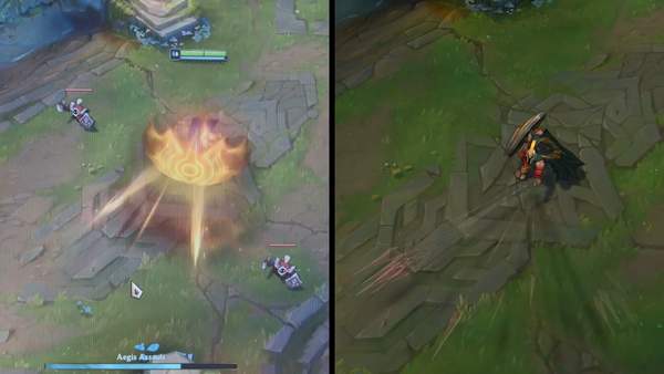潘森朝前方架起圣盾,格挡来自前方的所有伤害,同时施展反击。最后一下反击会造成额外伤害,即使E技能提前取消也仍会触发。强化后:神佑冲锋持续更长的时间。