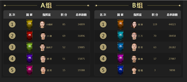 目前大赛还在小组赛阶段,十国大战已斗得难分难解,两位女指挥官在首届万人国战联赛中发挥得尤为出色,分别霸占积分榜A、B两组的头名,傲视天下。A组由女指挥官“小傲娇”领导的汉国以85积分,34899总杀敌数排名第一。B组由“猪猪”率领楚国以119积分,44023总杀敌数排名首位。