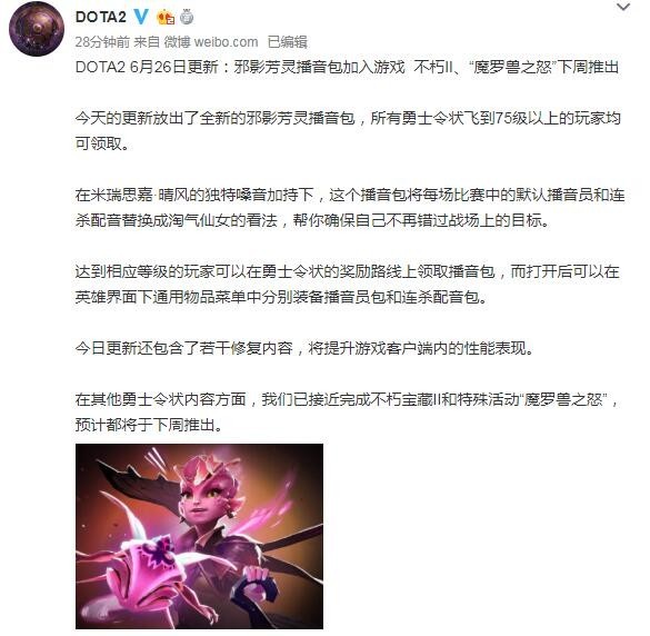 6月26日,《Dota2》官博发布了一则更新信息,更新将带来全新的邪影芳灵播音包,所有勇士令状飞到75级以上的玩家均可领取。同时,不朽宝藏II和特殊活动“魔罗兽之怒”已接近完成,预计都将于下周推出。