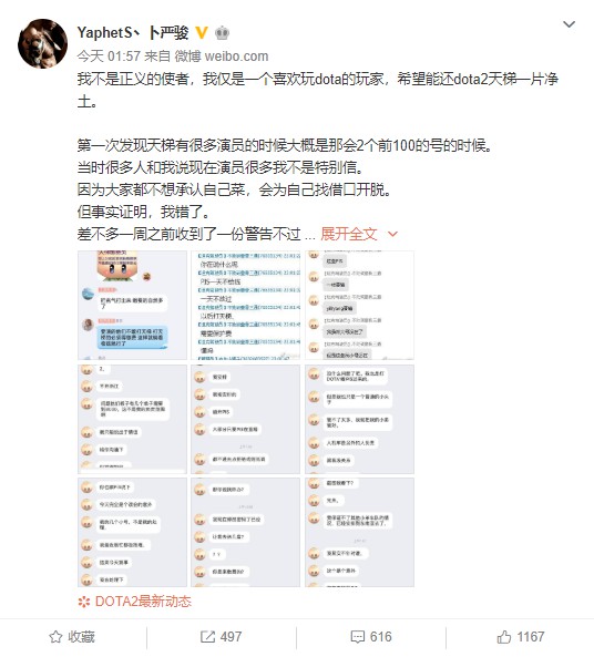 6月24日,Dota 2前职业选手、知名主播@YaphetS丶卜严骏 (简称PIS)在微博曝光Dota 2天梯上分恶势力,称被人警告“只要我交钱,想拿(天梯)前十都行”,否则就会被安排的“队友”故意输比赛,导致排名下降。