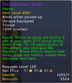 理论上,如果你可以一个人全程站在角落远离所有人,这个饰品特效就价值全程的270爆击和84精通。这显然是最好的情况,因为这一属性总量远远超过了同装等的属性饰品的期望。